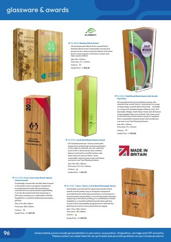 Unless stated, prices include personalisation in one colour, one position. Origination, carriage and VAT are extra.Please contact our sales team for an up to date and accurate quotation on your chosen products.conference & exhibition glassware & awards96 Unless stated, prices include personalisation in one colour, one position. Origination, carriage and VAT are extra.Please contact our sales team for an up to date and accurate quotation on your chosen products.%uf0ec%u000996-40945 Real Wood Block Award with Acrylic Face PlateUK manufactured real wood block awards with recycled clear acrylic fronts. Constructed in a range of responsibly sourced 28mm thick Oak. . Available in a range of 8 standard shapes; Oblong, Arch, Sail, Spinnaker, Wedge, Swell, Wave, Flame and all feature a hand applied satin wax oil finish. Full colour print to the front face of the wood or acrylic as required. Every sustainable material award sold contributes one tree in our Tree Planting Scheme.Size: 80 x 150mm Print area: 75 x 145mm Colours: %uf0a2Guide Price: 5 %u00a352.50%uf0ec%u000996-40944 Small Real Wood Column AwardUK manufactured oak column award with engraved or printed logo and personalisation to two sides as standard, you can make the most of the 3 dimensional views without being constricted to one flat surface only. Satin wood oil and wax finish. Every sustainable material award sold contributes one tree in our Tree Planting Scheme.Size: 58 x 58 x 190mm Print area: 53 x 53 x 185mm Colours: %uf0a2Guide Price: 5 %u00a341.25%uf0e7%u000996-38044 Bamboo Block AwardUK manufactured 40mm thick caramel finish bamboo block award. Sustainably sourced and proven to be a carbon neutral material. Full colour print or laser engrave to the front surface only. Satin wood oil finish.Size: 80 x 150mm Print area: 75 x 145mmColours: %uf0a2Guide Price: 5 %u00a334.25%uf0e8%u000996-43505 15cm x 10cm x 3.5cm Beech Rectangle AwardSustainably sourced and FSC approved wooden beech awards are the perfect way to recognise exceptional accomplishments while demonstrating a commitment to environmental responsibility. It can be decorated with laser engraving or full colour printing, or a combination of both. Supplied in a recycled cardboard presentation gift box. As part of the sustainability programme we will fund the planting of a tree for every award that we supply.Size: 150 x 100 x 35mm Print area: 140 x 90mmColours: %uf0a2Guide Price: 24 %u00a335.25ALL PRODUCTS%uf0ec%u000996-43504 21cm x 6cm x 6cm Beech Square Column AwardSustainably sourced the wooden beech award is the perfect way to recognise exceptional accomplishments while demonstrating a commitment to environmental responsibility. It can be decorated with laser engraving or full colour printing, or a combination of both. Supplied in a recycled cardboard presentation gift box.Size: 210 x 60 x 60mmPrint area: 200 x 50mmColours: %uf0a2Guide Price: 24 %u00a347.42